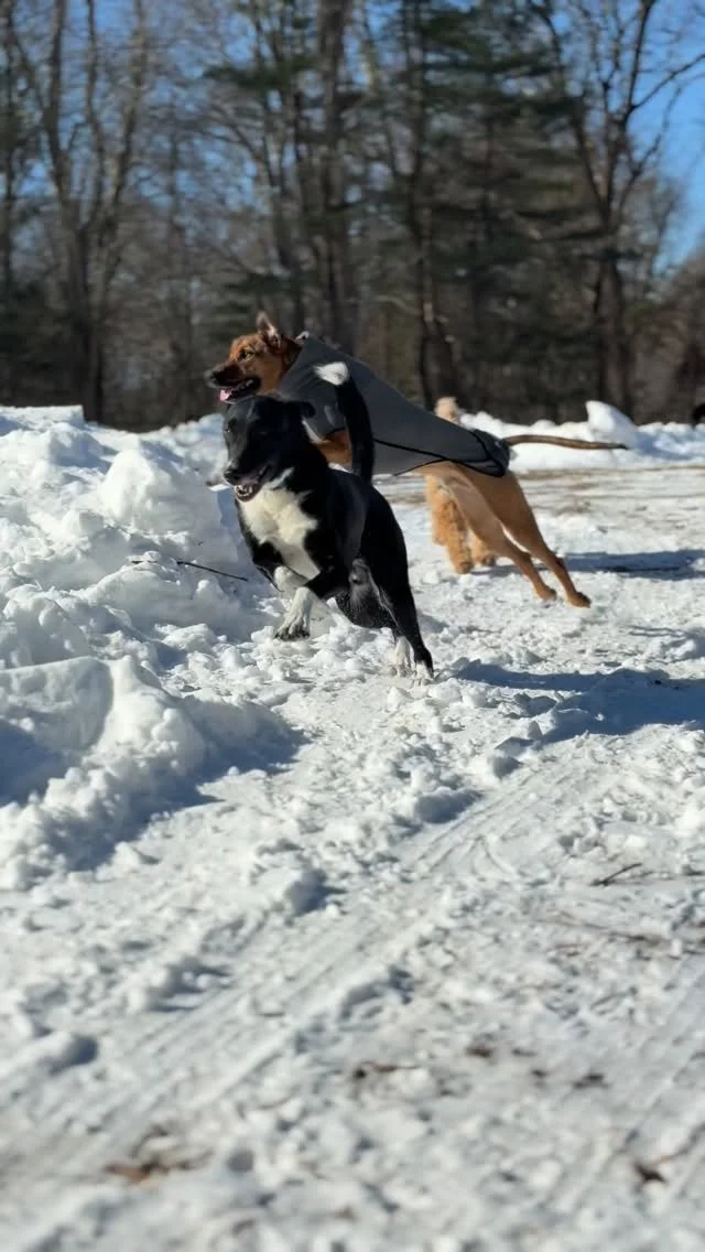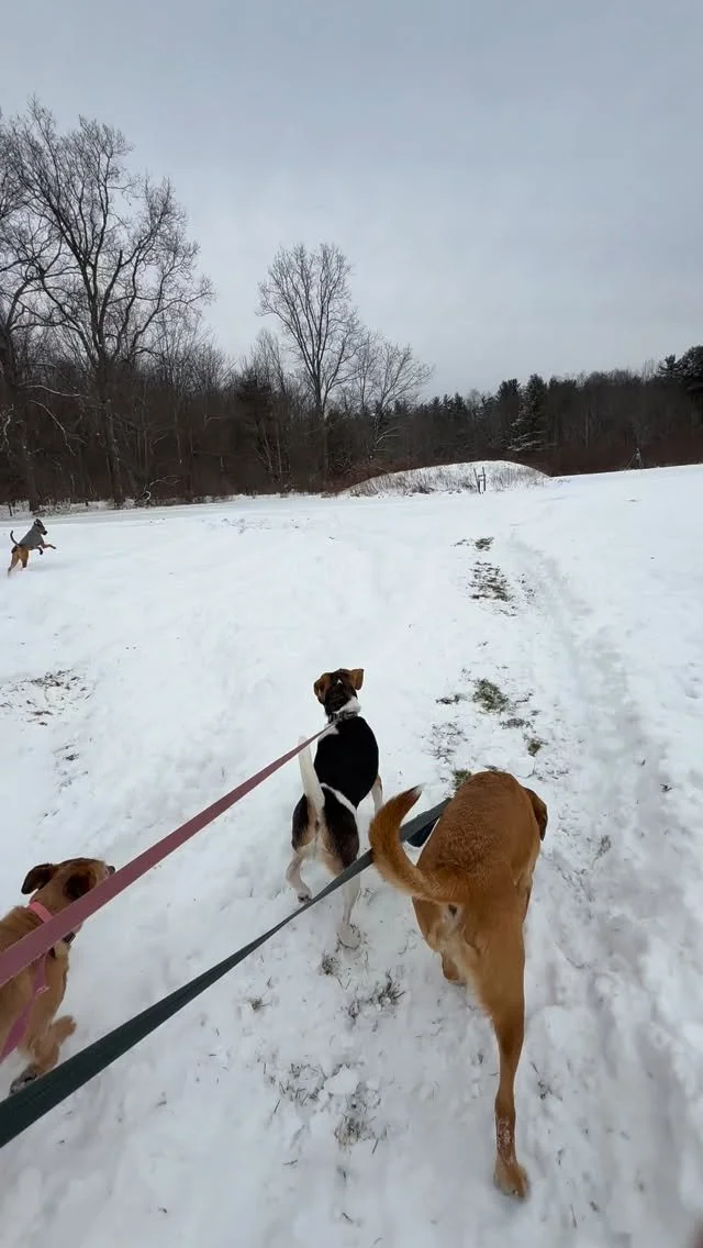 Rain or shine, we get dogs outside to hike trails, explore terrain, socialize with other well-balanced dogs, and practice basic obedience naturally along the way. Fresh air, open space, good company — just dog stuff.
